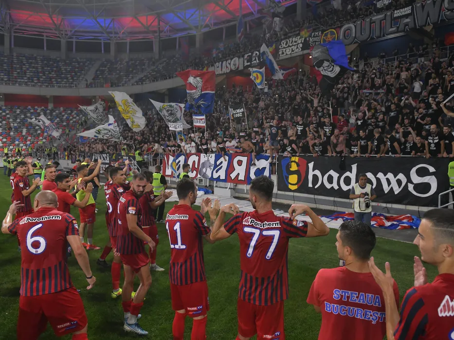 Fotbalistii stelisti se bucura alaturi de galerie dupa meciul de fotbal dintre Steaua Bucuresti si FK Csikszereda Miercurea Ciuc, contand pentru Liga a-2-a Casa Pariurilor, desfasurat pe Stadionul Steaua-Ghencea din Bucuresti, miercuri 4 august 2021. © FOTO:Razvan Pasarica/SPORT PICTURES