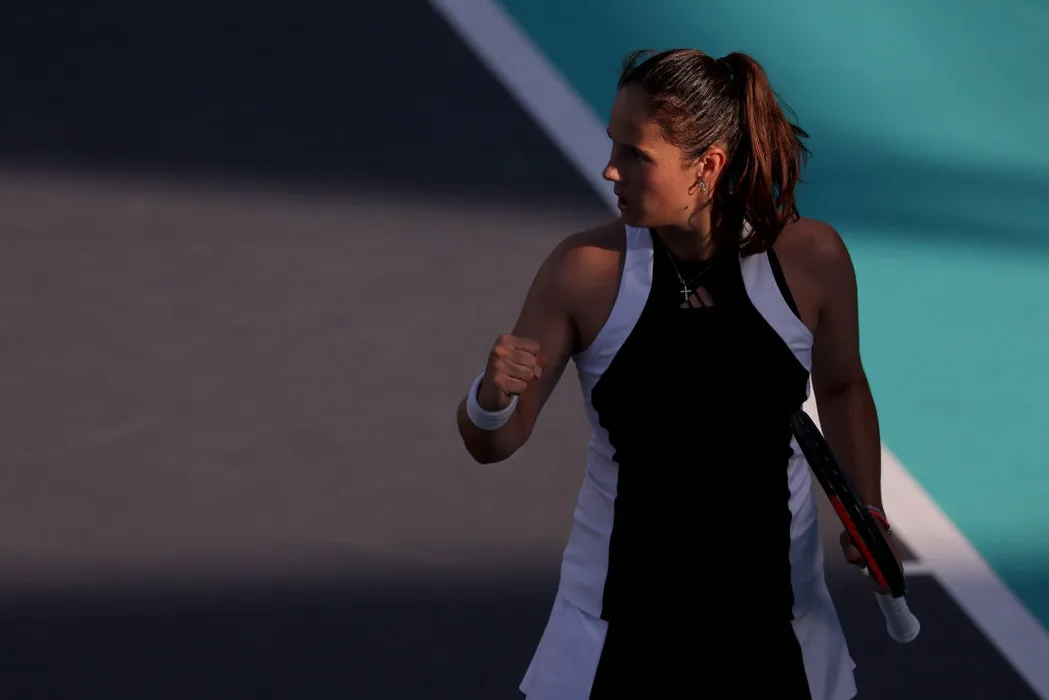 ABU DHABI, UNITED ARAB EMIRATES - FEBRUARY 10: Daria Kasatkina celebrates scoring a point against Beatriz Haddad Maia of Brazil during their semi-final match on day 6 of the Mubadala Abu Dhabi Open, part of the Hologic WTA Tour, at Zayed Sports City on February 10, 2024 in Abu Dhabi, United Arab Emirates. (Photo by Christopher Pike/Getty Images)