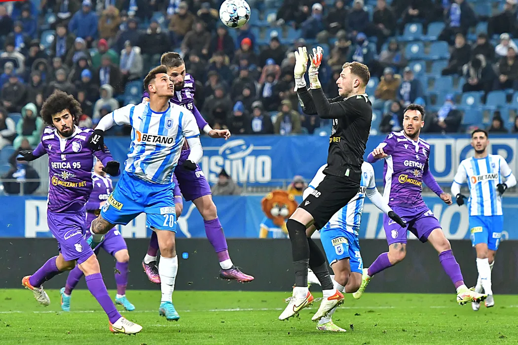 Alexandru Greab si Jovan Markovic joaca in meciul de fotbal dintre echipele Universitatea Craiova ( echipament alb albastru ) si FC Arges din play-off-ul Ligii 1, meci disputat pe stadionul Ion Oblemenco din Craiova, vineri, 11 martie 2022. REMUS BADEA / MEDIAFAX FOTO