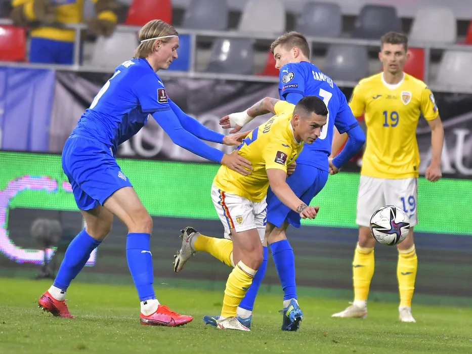 Brynjar Ingi Bjarnason, Nicolae Stanciu si Alfons Sampsted in meciul de fotbal dintre Romania si Islanda, din cadrul Preliminariilor Campionatului Mondial 2022, desfasurat pe Stadionul Steaua din Bucuresti, joi 11 noiembrie 2021. © FOTO:Razvan Pasarica/SPORT PICTURES