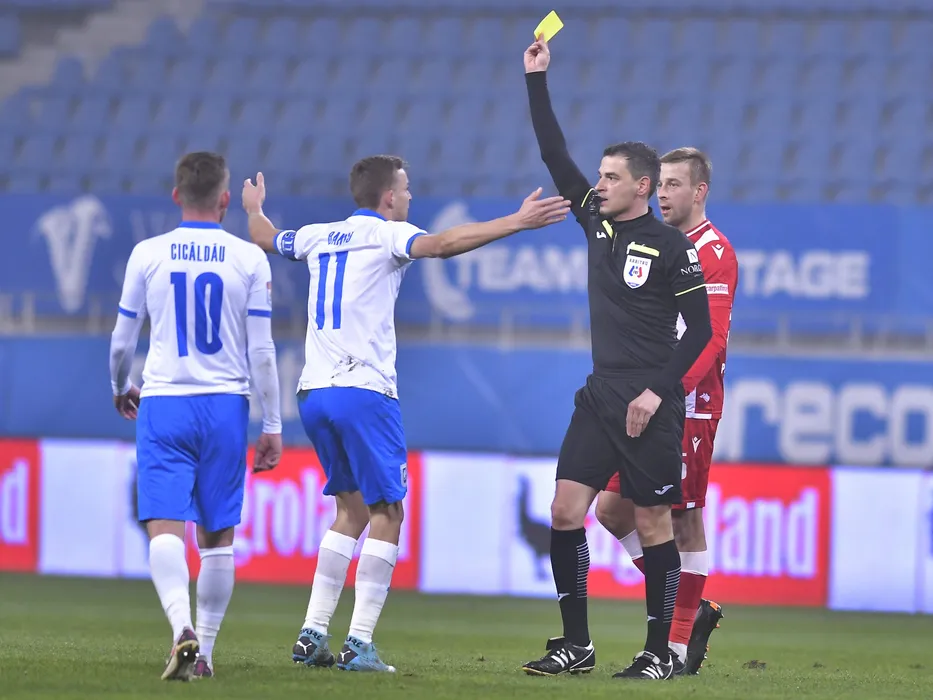 Arbitrul central Florin Andrei acorda un cartonas galben lui Nicusor Silviu Bancu sub privirea lui Janusz Krzysztof Gol in meciul de fotbal dintre Universitatea Craiova si Dinamo Bucuresti, contand pentru Liga 1 Casa Pariurilor, desfasurat fara spectatori pe Stadionul Ion Oblemenco din Craiova, sambata 6 februarie 2021. © FOTO:Razvan Pasarica/SPORT PICTURES