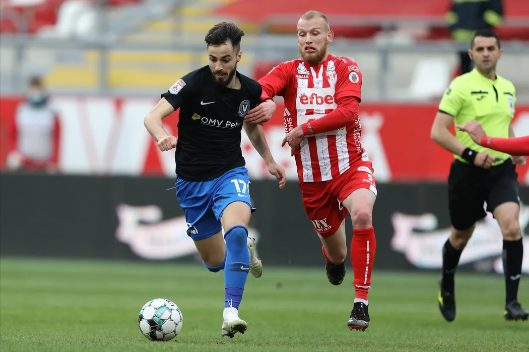 Andrei Ciobanu de la Viitorul si Modestas Vorobjovas de la UTA isi disputa posesia balonului in partida dintre UTA Arad (echipament alb-rosu) si Viitorul Constanta, partida desfasurata in prima etapa din play-out-ul Ligii 1 la fotbal, pe Arena Francisc Neuman din Arad, vineri, 16 aprilie 2021. CIPRIAN PETCUT / MEDIAFAX FOTO