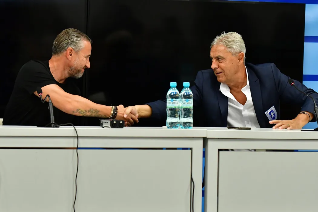 Laurentiu Reghecampf (S) si Sorin Cartu (D) in timpul conferintei de presa care a avut loc la stadionul Ion Oblemenco , marti 27 iulie 2021 . REMUS BADEA / MEDIAFAX FOTO