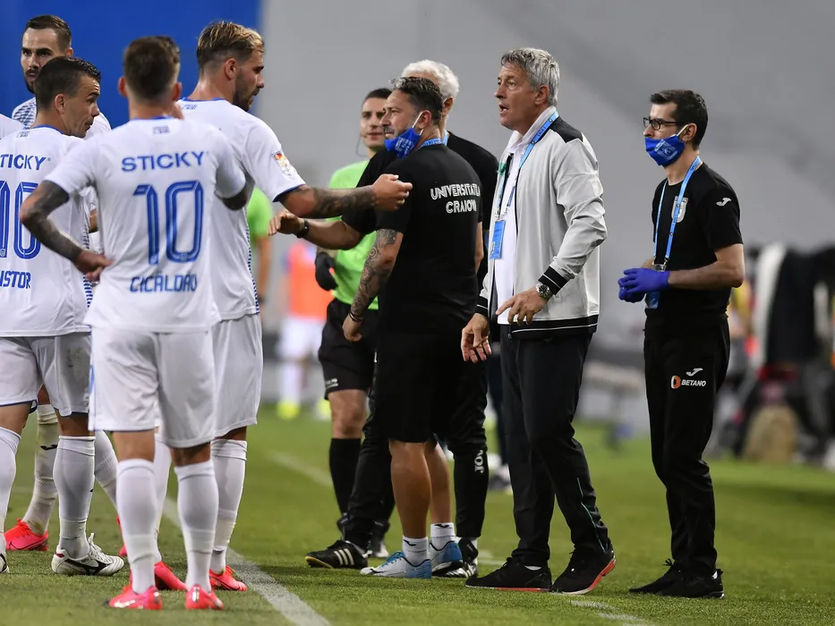 Bucurie a fotbalistilor Craiovei cu Dan Nistor, Mihai Balasa si Elvir Koljic alaturi de antrenorul lor Cristiano Bergodi in meciul de fotbal dintre Universitatea Craiova si Astra Giurgiu, contand pentru play-off-ul Ligii 1 Casa Pariurilor, disputat fara spectatori pe Stadionul Ion Oblemenco din Craiova, vineri 19 iunie 2020. © FOTO:Razvan Pasarica/SPORT PICTURES