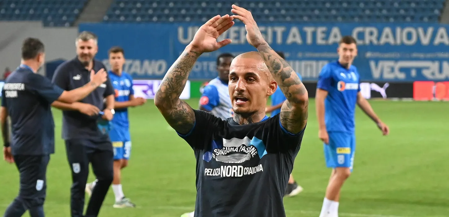 Ionut Alexandru Mitrita saluta galeria dupa meciul de fotbal dintre Universitatea Craiova si FC Hermannstadt, contand pentru Superliga Superbet, desfasurat pe Stadionul Ion Oblemenco din Craiova, vineri 4 august 2023. © FOTO:Razvan Pasarica/SPORT PICTURES