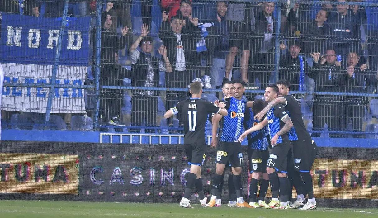 Galeria craioveana se bucura alaturi de fotbalistii craioveni , Jovan Markovic, Screciu Vladimir Ionut, Paul Papp si Stefan Baiaram dupa un gol reusit in meciul de fotbal dintre Farul Constanta si Universitatea Craiova, contand pentru Play-off-ul Ligii 1 Casa Pariurilor, desfasurat pe Stadionul central al Academiei Gheorghe Hagi din Ovidiu, sambata 16 aprilie 2022. © FOTO:Razvan Pasarica/SPORT PICTURES