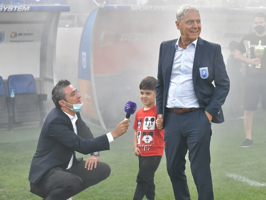Sorin Cartu alaturi de nepot la interviu dupa meciul de fotbal dintre Universitatea Craiova si Academica Clinceni, contand pentru Play off-ul Ligii 1 Casa Pariurilor, desfasurat pe Stadionul Ion Oblemenco din Craiova, miercuri 26 mai 2021. © FOTO:Razvan Pasarica/SPORT PICTURES