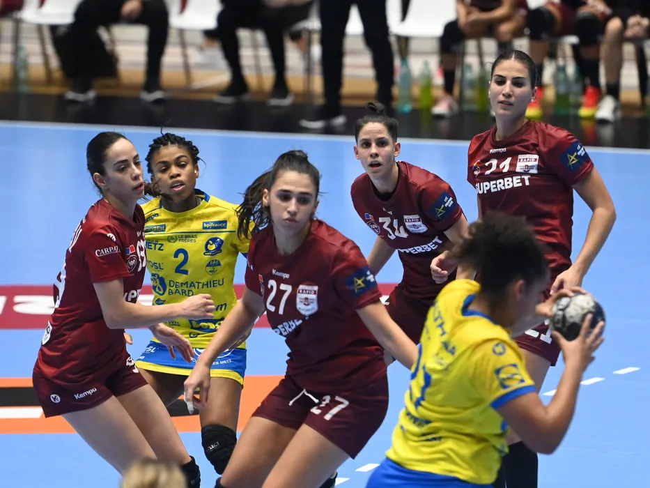 Sorina Maria Grozav (Tirca), Lorena Gabriela Ostase, Fraga Alicia Fernandez, Bruna Aparecida Almeida de Paula si Irene Espinola Perez in meciul de handbal feminin dintre Rapid Bucuresti si Metz Handball, contand pentru Liga Campionilor, desfasurat in Sala Polivalenta-Ioan Kunst Ghermanescu din Bucuresti, duminica 18 septembrie 2022. © FOTO:Razvan Pasarica/SPORT PICTURES
