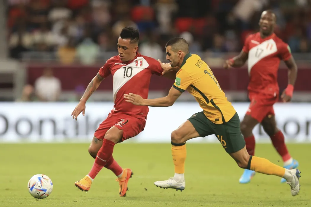 Peru's Christian Cueva. Left and Australia's Aziz Behich fight for the ball during the World Cup 2022 qualifying play-off soccer match between Australia and Peru in Al Rayyan, Qatar, Monday, June 13, 2022.,Image: 699405285, License: Rights-managed, Restrictions: This content is intended for editorial use only. For other uses, additional clearances may be required., Model Release: no, Pictured: Christian Cueva
