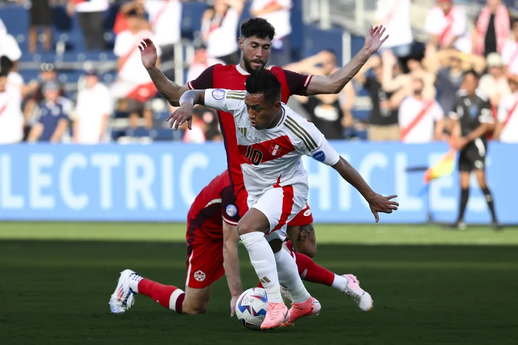 Peru's Christian Cueva (10) tries to dribble away from Canada's Jonathan Osorio during the second half of a Copa America Group A soccer match in Kansas City, Kan., Tuesday, June 25, 2024.,Image: 884946245, License: Rights-managed, Restrictions: This content is intended for editorial use only. For other uses, additional clearances may be required., Model Release: no, Pictured: Christian Cueva,Jonathan Osorio