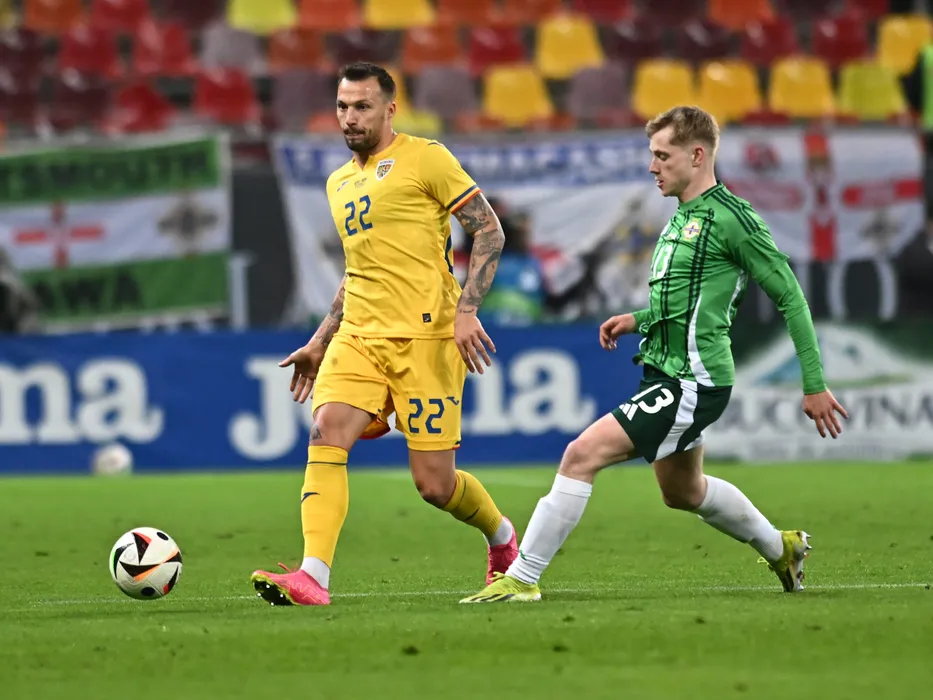 Vasile Mogos si Patrick Lane in meciul amical de fotbal dintre Romania si Irlanda de Nord, desfasurat pe Arena Nationala, vineri 22 martie 2024. © FOTO:Razvan Pasarica/SPORT PICTURES
