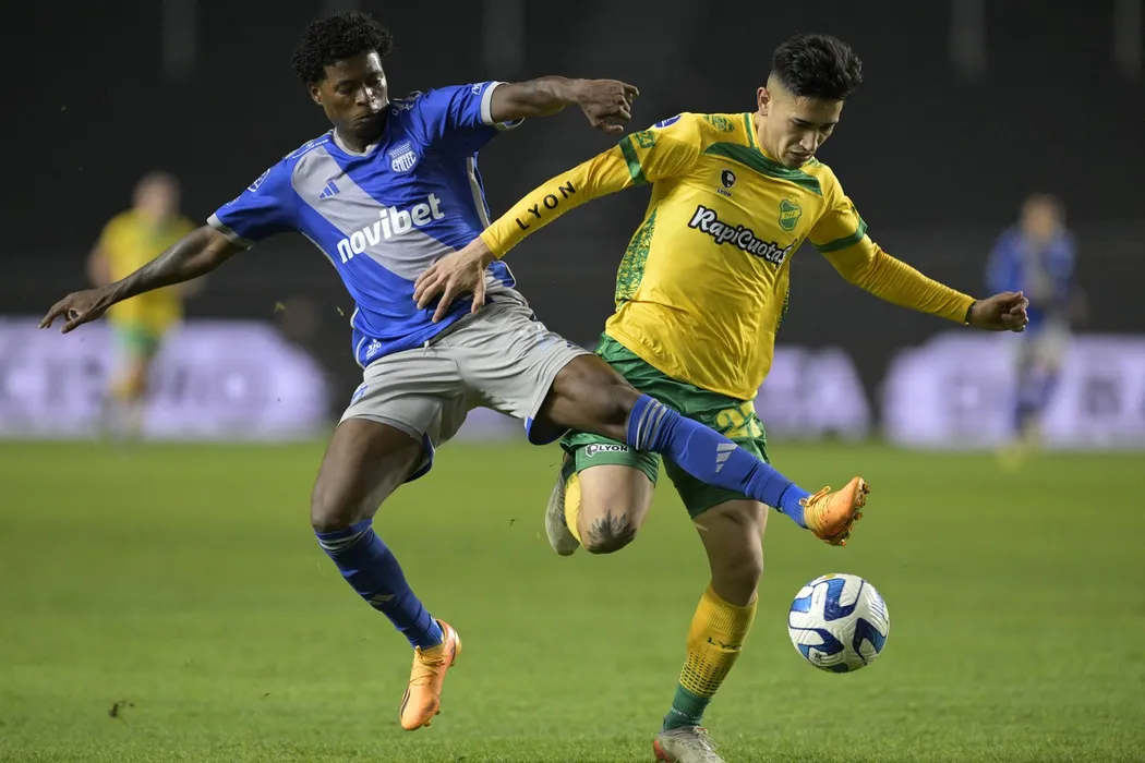 Emelec's midfielder Jackson Rodriguez (L) and Defensa y Justicia's forward Santiago Solari fight for the ball during the Copa Sudamericana round of 16 second leg football match between Argentina's Defensa y Justicia and Ecuador's Emelec, at the Estadio Unico Diego Armando Maradona stadium in La Plata, Argentina, on August 8, 2023.,Image: 795449004, License: Rights-managed, Restrictions: , Model Release: no