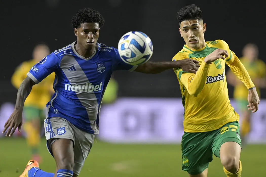 Emelec's midfielder Jackson Rodriguez (L) and Defensa y Justicia's forward Santiago Solari fight for the ball during the Copa Sudamericana round of 16 second leg football match between Argentina's Defensa y Justicia and Ecuador's Emelec, at the Estadio Unico Diego Armando Maradona stadium in La Plata, Argentina, on August 8, 2023.,Image: 795449006, License: Rights-managed, Restrictions: , Model Release: no