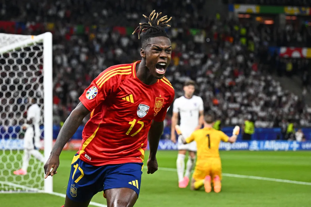 14 July 2024, Berlin: Spain's Nico Williams celebrates scoring his side's first goal during the UEFA Euro 2024 final soccer match between Spain and England at the Olympic Stadium. Photo: Tom Weller/dpa