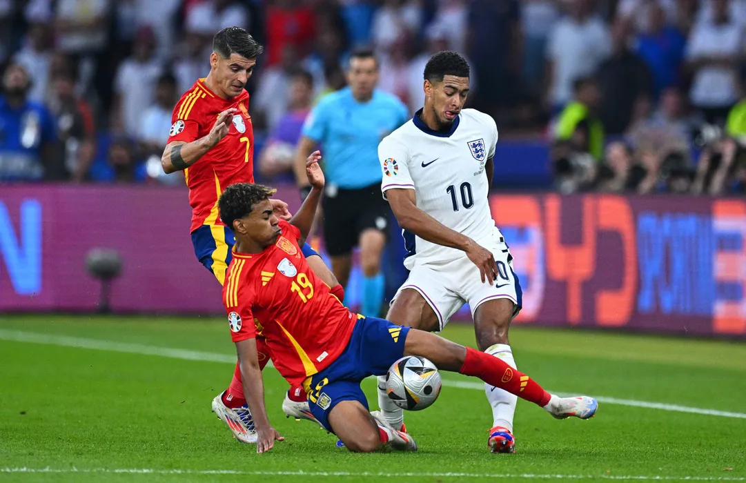 14 July 2024, Berlin: Spain's Lamine Yamal and England's Jude Bellingham (R) battle for the ball during the UEFA Euro 2024 final soccer match between Spain and England at the Olympic Stadium. Photo: Tom Weller/dpa
