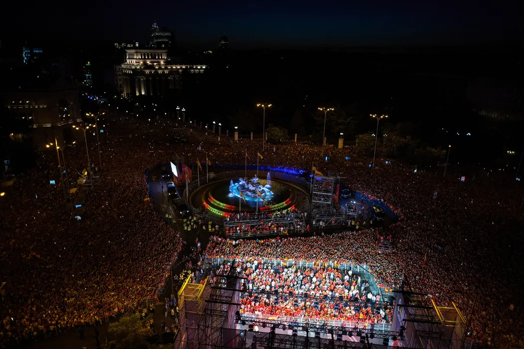 July 15, 2024, Madrid, Spain: Thousands of people with Spanish flags, seen during the celebration of the European champion title of the Spanish soccer team in the Plaza de la Cibeles. The Spanish soccer team was proclaimed European champion, after beating the England team in the Euro 2024 soccer tournament in Berlin, Germany on July 14, 2024.,Image: 889960320, License: Rights-managed, Restrictions: , Model Release: no