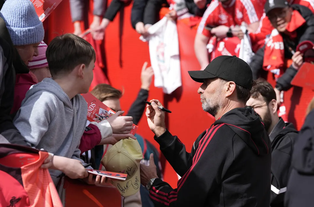 28 March 2026, United Kingdom, Liverpool: Jurgen Klopp, who is part of the management team, signs autographs ahead of the Legends soccer match between Liverpool Legends and Borussia Dortmund at Anfield. Photo: Peter Byrne/PA Wire/dpa