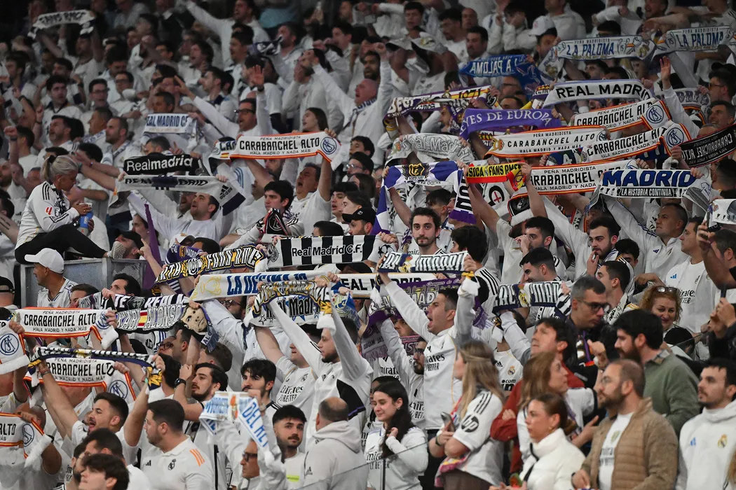 07 April 2026, Spain, Madrid: Madrid fans cheer in the stands prior to the start of the UEFA Champions League quarterfinal first leg soccer match between Real Madrid and Bayern Munich at Santiago Bernabeu. Photo: Peter Kneffel/dpa