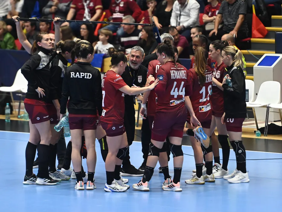 Handbalistele rapidiste la un timeout alaturi de antrenorul lor Carlos Viver in meciul de handbal feminin dintre Rapid Bucuresti si Gyor Audi Eto KC, contand pentru Liga Campionilor, desfasurat in Sala Polivalenta-Ioan Kunst Ghermanescu din Bucuresti, duminica 11 decembrie 2022. © FOTO:Razvan Pasarica/SPORT PICTURES