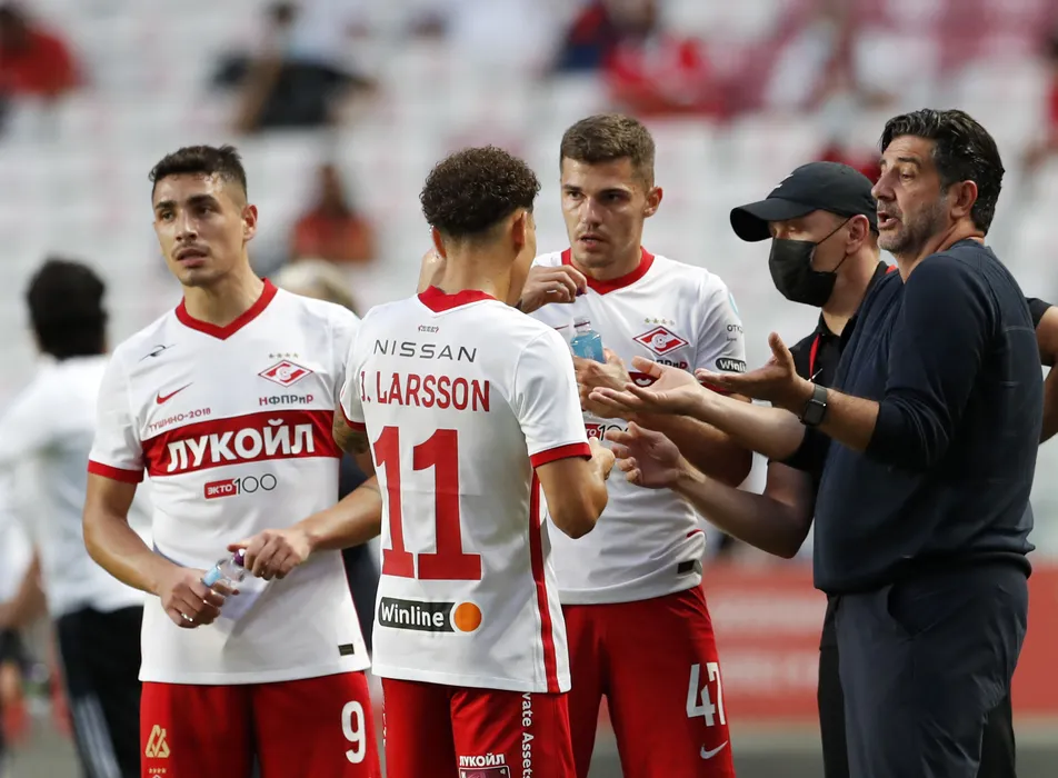 Spartak coach Rui Vitoria, right, gives instructions to his players during the Champions League third qualifying round, 2nd leg, soccer match between Benfica and Spartak Moskva at the Luz stadium in Lisbon, Tuesday, Aug. 10, 2021. (AP Photo/Armando Franca)