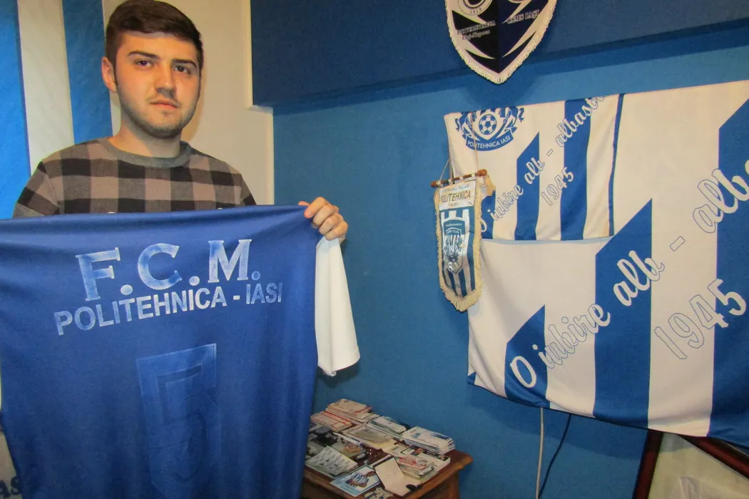 SPECIAL | Muzeul alb-albastru! Un tânăr suporter al Politehnicii Iași și-a transformat camera din apartament într-un veritabil muzeu, cu aproape 1.000 de obiecte colecționate