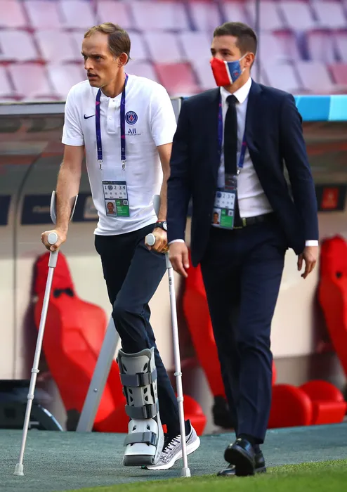 HANDOUT - 23 August 2020, Portugal, Lisbon: Paris Saint-Germain's head coach Thomas Tuchel (L) walks onto the pitch prior to the start of the UEFA Champions League Final soccer match between Paris Saint-Germain and Bayern Munich at the Estadio da Luz. Photo: Julian Finney/Getty Images via UEFA/dpa - ATTENTION: editorial use only in connection with the latest coverage about the transmission. The image may not be modified and can only be used in its entirety, i.e. may not be cropped. May not be archived. Only for use if the credit mentioned above is referenced in full