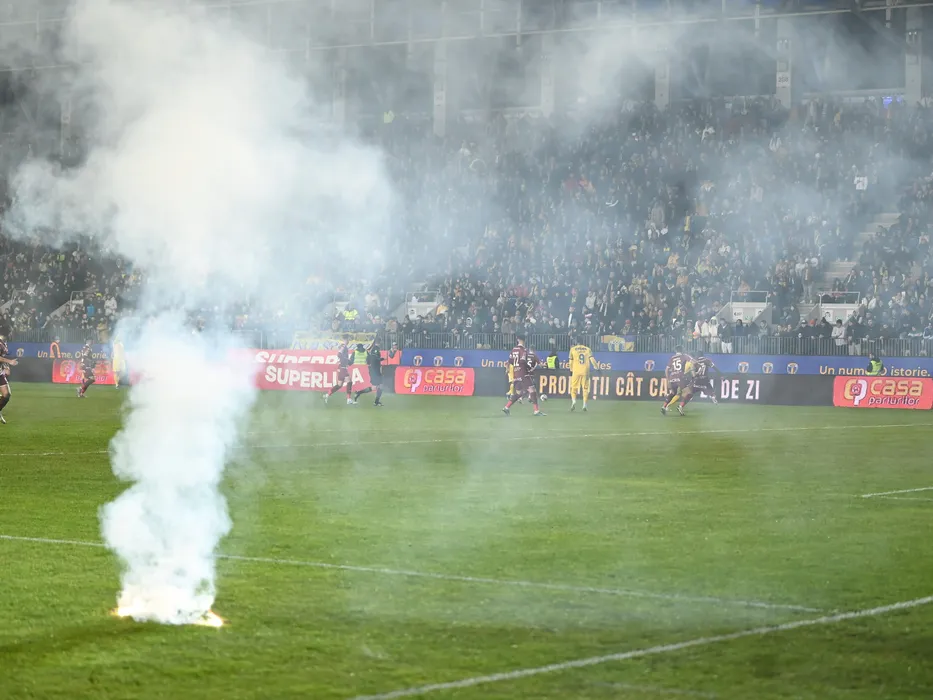 Fumigene pe teren la meciul de fotbal dintre Petrolul Ploiesti si Rapid Bucuresti, din cadrul Superligii Superbet, desfasurat pe Stadionul Ilie Oana din Ploiesti, vineri 15 decembrie 2023. © FOTO:Razvan Pasarica/SPORT PICTURES