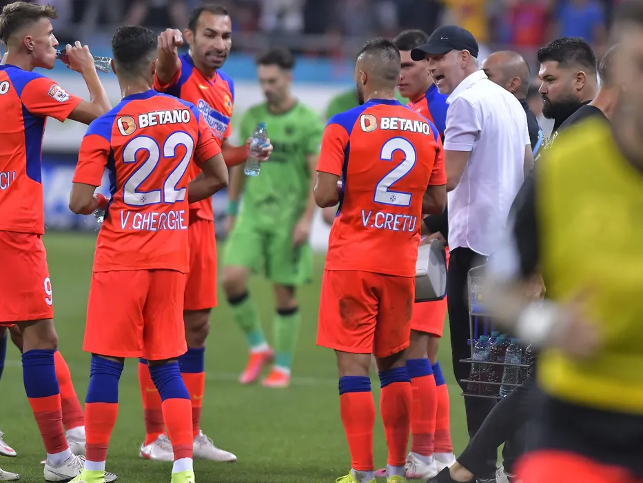 Edward Iordanescu alaturi de Octavian George Popescu si Valentin Cretu la o pauza de hidratare in meciul de fotbal dintre FCSB si Dinamo Bucuresti, contand pentru Liga 1 Casa Pariurilor, desfasurat pe Arena Nationala din Bucuresti, duminica 12 septembrie 2021. © FOTO:Razvan Pasarica/SPORT PICTURES