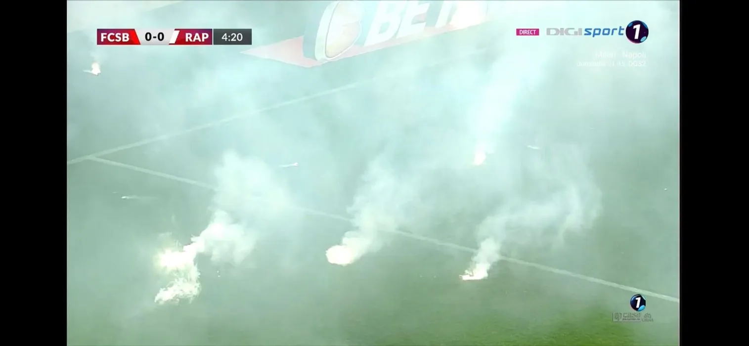 Spectacol pirotehnic ca pe vremuri în derby-ul FCSB – Rapid! Arsenalul de fumigene, torțe și petarde a întrerupt meciul de pe Arena Națională | FOTO