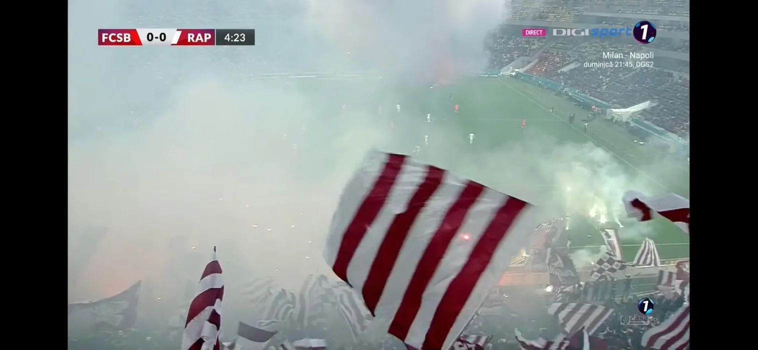 Spectacol pirotehnic ca pe vremuri în derby-ul FCSB – Rapid! Arsenalul de fumigene, torțe și petarde a întrerupt meciul de pe Arena Națională | FOTO