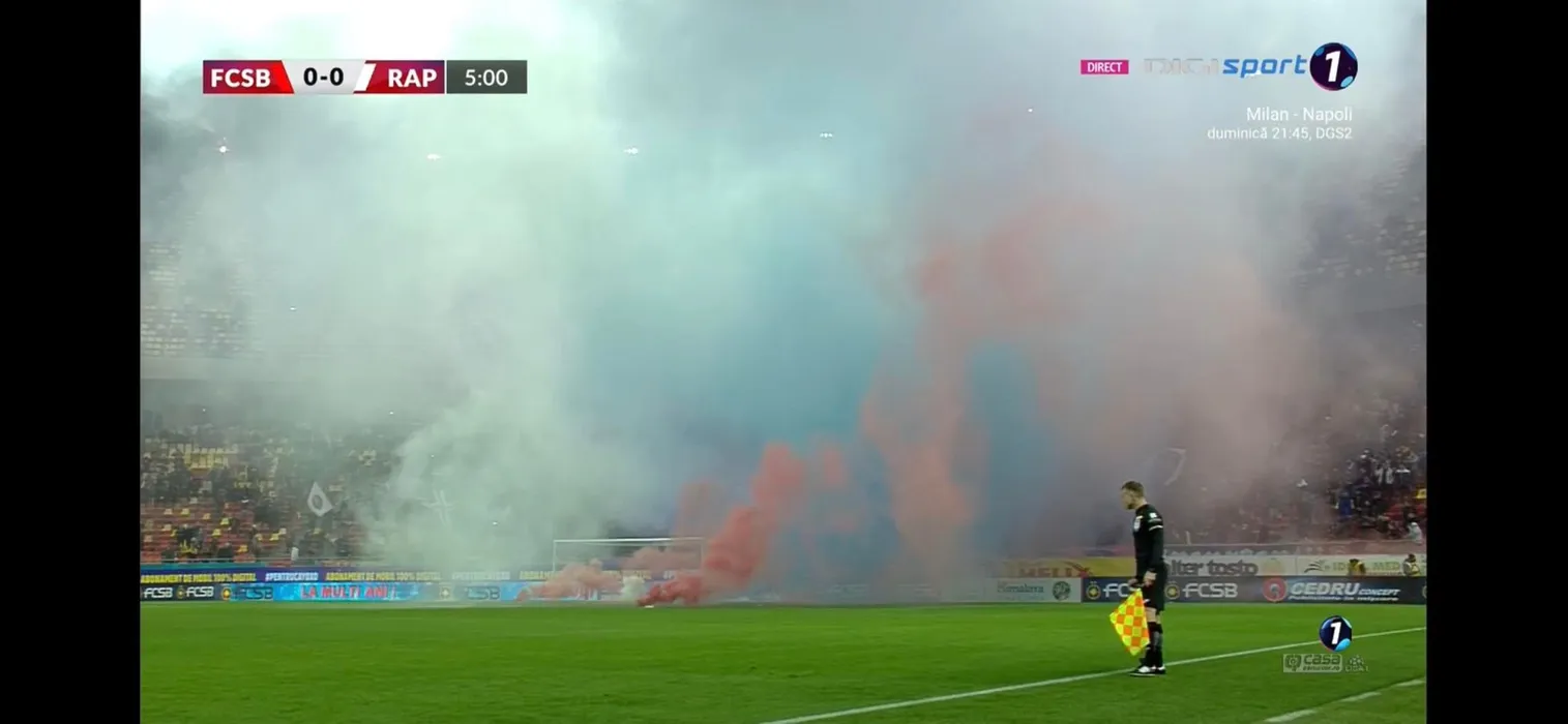 Spectacol pirotehnic ca pe vremuri în derby-ul FCSB – Rapid! Arsenalul de fumigene, torțe și petarde a întrerupt meciul de pe Arena Națională | FOTO
