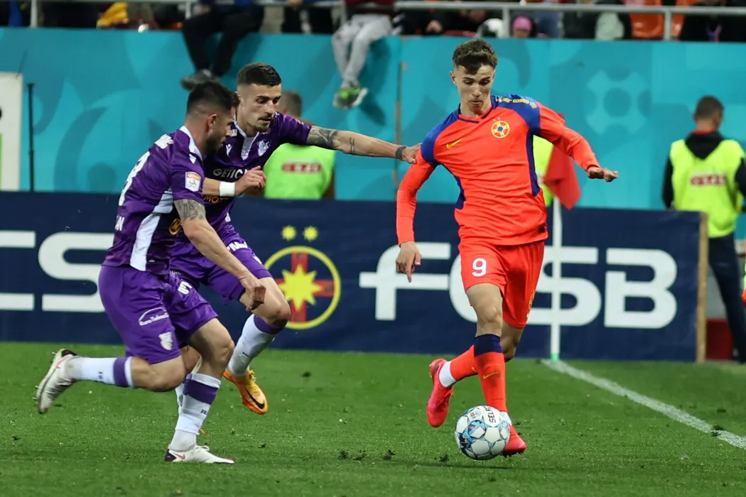 Octavian Popescu (D), de la FCSB, suteaza in timpul meciului de fotbal contra echipei FC Arges din etapa a 7- a a play-off-ului Ligii 1, disputat pe Arena Nationala din Bucuresti, luni, 2 mai 2022. GEORGE FILIP / MEDIAFAX FOTO
