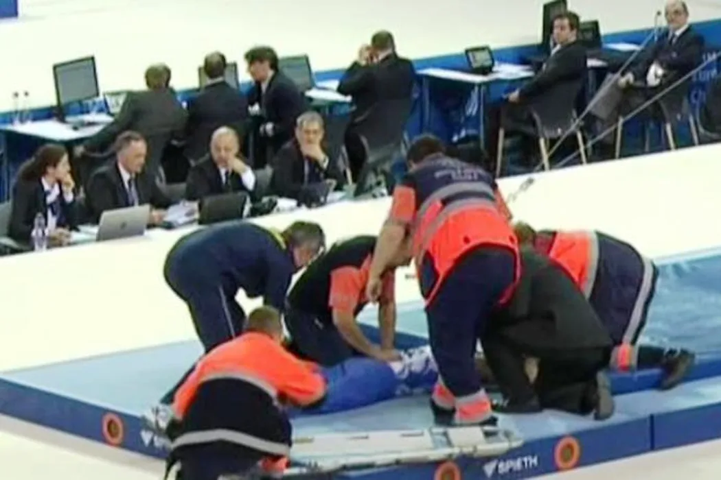 Sperietură uriașă la Europeanul de Gimnastică de la Cluj: Laurențiu Nistor a părăsit podiumul de concurs pe targă și a fost dus de urgență la spital
