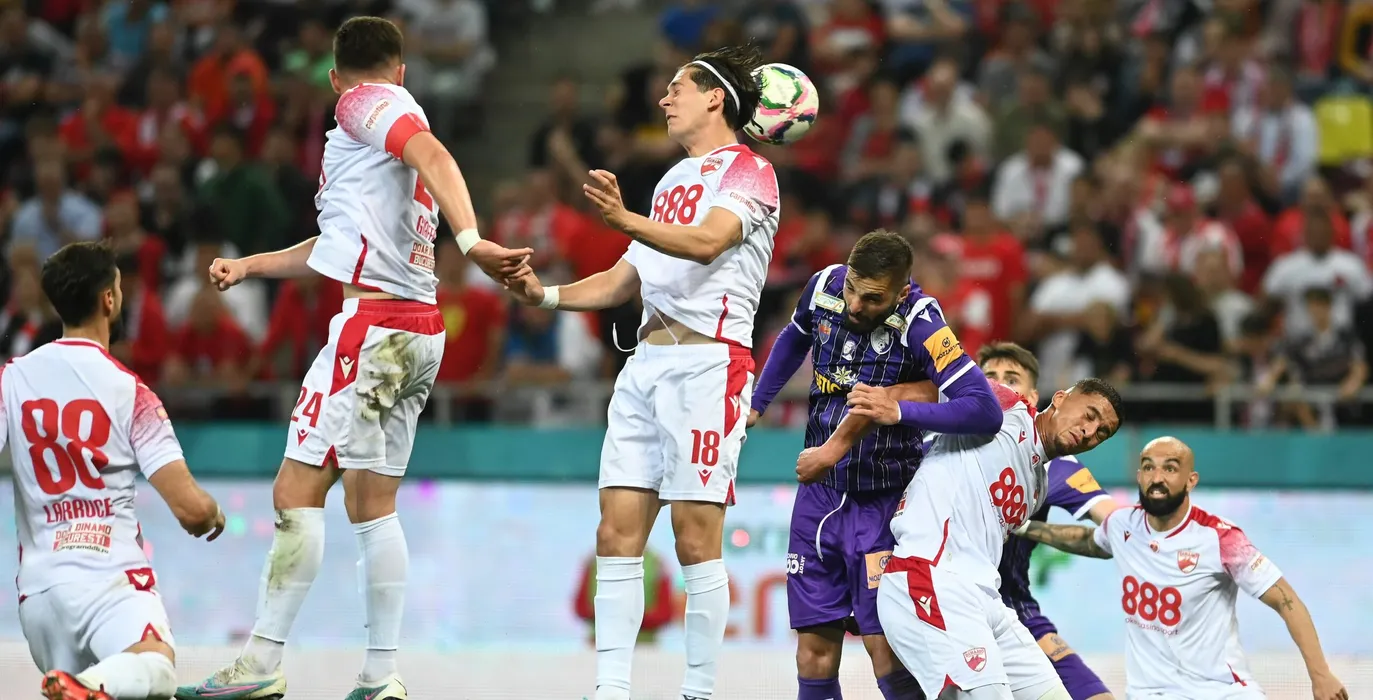 Valentin Ioan Borcea, Alin Dobrosavlevici, Quentin Alexandre Bena si Gabriel Rodrigues De Moura in meciul de fotbal dintre Dinamo Bucuresti si FC Arges, contand pentru mansa tur a barajului de promovare in Superliga Superbet, desfasurat pe Arena Nationala din Bucuresti, luni 29 mai 2023. © FOTO:Razvan Pasarica/SPORT PICTURES