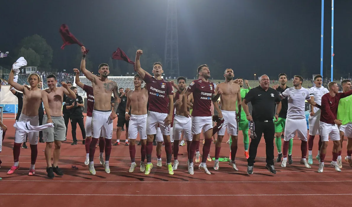 Fotbalistii rapidisti alaturi de antrenorul lor Mihai Iosif canta cu galeria dupa meciul de fotbal dintre FC Arges si Rapid Bucuresti, contand pentru Liga 1 Casa Pariurilor, desfasurat pe Stadionul Nicolae Dobrin din Pitesti, sambata 7 august 2021. © FOTO:Razvan Pasarica/SPORT PICTURES