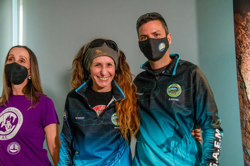 epa10572274 Spanish elite athlete, mountaineer and climber Beatriz Flamini (C) poses with assistance coordinator David Reyes (R), after leaving a cave where she remained isolated for 500 days at a depth of 70 meters, in the coastal town of Motril, Granada, Spain, 14 April 2023. Flamini broke the world record for the longest time spent in a cave as part of a scientific experiment within the 'Timecave project'. The project was overseen by researchers who accurately studied the effects of isolation on Flamini's body and brain, including cognitive functions. EPA/Alba Feixas
