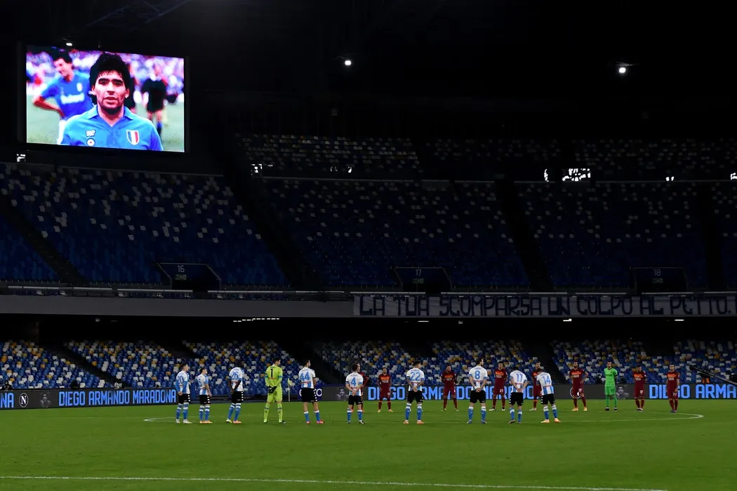 A portrait of Diego Armando Maradona is seen on the screen during a minute of silence prior to the Serie A football match between SSC Napoli and AS Roma at San Paolo stadium in Naples (Italy), November 29th 2020. SSC Napoli team played the match with a special shirt dedicated to Diego Armando Maradona. Photo Andrea Staccioli / Insidefoto /Sipa USA,Image: 572448439, License: Rights-managed, Restrictions: *** World Rights Except Germany, Italy, Japan, and The Netherlands ***, Model Release: no