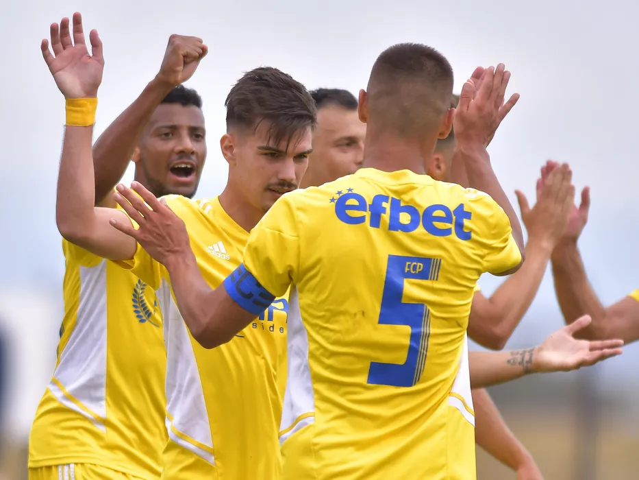 Bucurie a fotbalistilor ploiesteni dupa un gol marcat cu Marius Cioiu, Georgi Pashov si Valentin Ticu in meciul amical de fotbal dintre Petrolul Ploiesti si Chindia Targoviste, desfasurat pe Stadionul comunal din Strejnic, sambata 9 iulie 2022. © FOTO:Razvan Pasarica/SPORT PICTURES