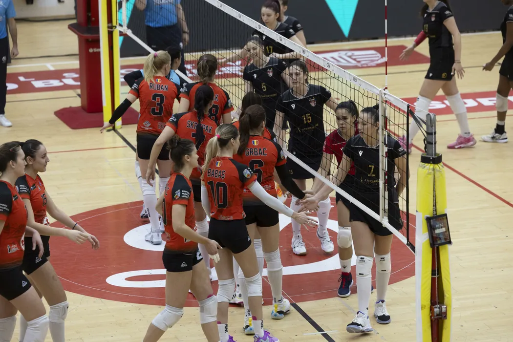 CVele două echipe se salută la startul meciului de volei feminin între CS Dinamo Bucuresti și CSM Lugoj, contând pentru Cupa României 23-24 Feminin desfășurat în Sala Polivalentă Dinamo din București, miercuri 13 decembrie 2023. © FOTO:Mihai NEACSU/SPORT PICTURES