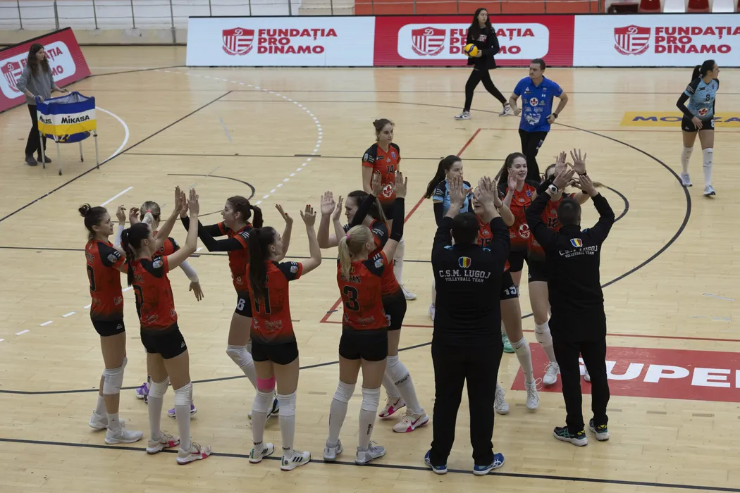 Echipă bănățeană la startul meciului de volei feminin între CS Dinamo Bucuresti și CSM Lugoj, contând pentru Cupa României 23-24 Feminin desfășurat în Sala Polivalentă Dinamo din București, miercuri 13 decembrie 2023. © FOTO:Mihai NEACSU/SPORT PICTURES