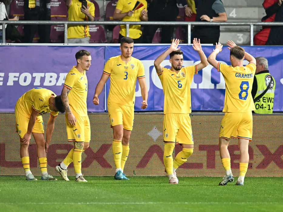 Fotbalistii romani Alexandru Pantea, Rareș Ilie, Cristian Ignat, Ovidiu Perianu si Constantin Grameni se bucura dupa primul gol reusit de Ianis Stoica in meciul de fotbal dintre Romania U21 si Elvetia U21, contand pentru Preliminariile UEFA EURO 2025, desfasurat pe Superbet Arena Giulesti din Bucuresti, marti 15 octombrie 2024. © FOTO:Razvan Pasarica/SPORT PICTURES