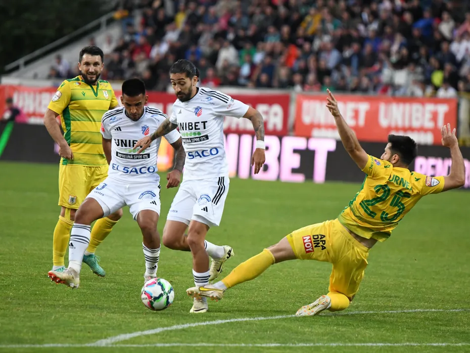 Eduard Marian Florescu, Juan Cruz Kaprof și Andrei Panait în meciul de fotbal dintre FC Botoșani și CS Mioveni, contând pentru Baraj Superliga Superbet, desfășurat pe Stadionul Municipal din Botoșani, vineri 17 mai 2024. © FOTO: Tudi/SPORT PICTURES