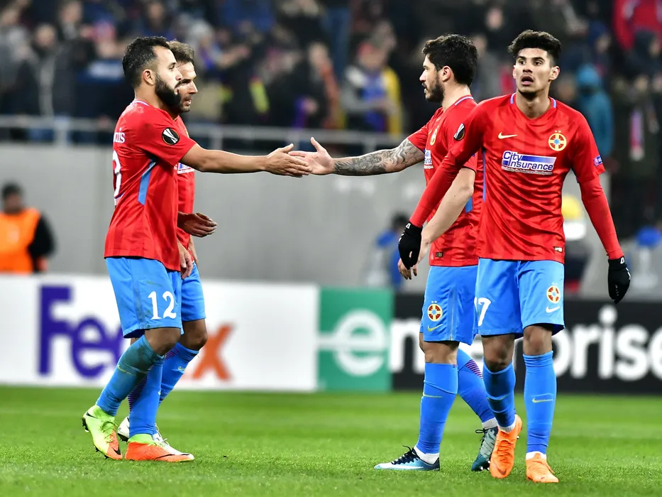 Junior Morais,Cristian Tanase si Florinel Coman dupa meciul de fotbal dintre FC Steaua Bucuresti si SS Lazio Roma, contand pentru Liga Europa, desfasurat pe Arena Nationala din Bucuresti, joi 15 februarie 2018. © FOTO Razvan Pasarica/SPORT PICTURES