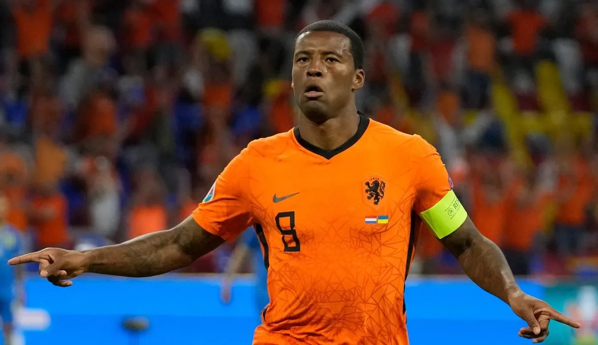 Netherlands' midfielder Georginio Wijnaldum celebrates his first goal during the UEFA EURO 2020 Group C football match between the Netherlands and Ukraine at the Johan Cruyff Arena in Amsterdam on June 13, 2021.,Image: 615507674, License: Rights-managed, Restrictions: , Model Release: no, Credit line: Profimedia