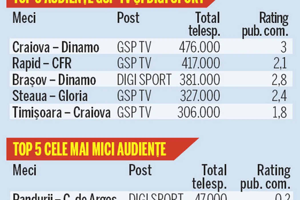 Steaua, Dinamo și Craiova conduc după zece etape în topul audiențelor TV!** VEZI CLASAMENTUL!