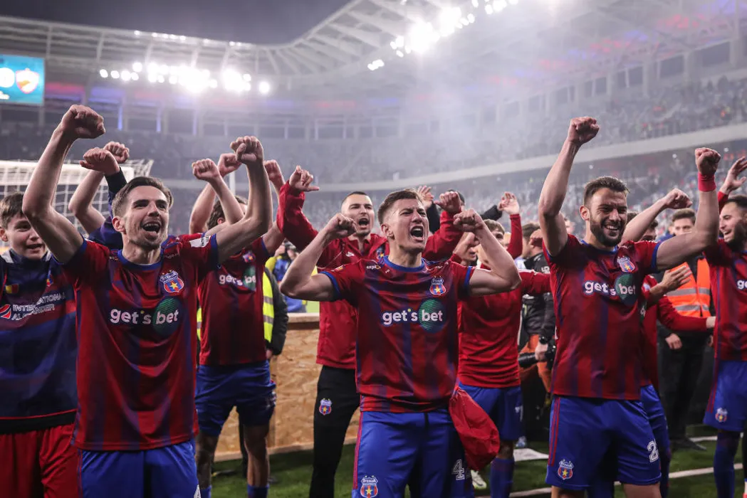 BUCHAREST, ROMANIA - APRIL 18: Players of Steaua Bucuresti celebrates the victory with the fans during the Round 4 of Second League Romania - Play-off match between Steaua Bucuresti and Dinamo Bucuresti at Steaua Stadium on April 18, 2023 in Bucharest, Romania. (Photo by Vasile Mihai-Antonio/Getty Images)