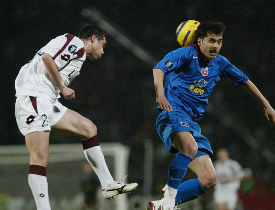 Vasile Maftei (L) from Rapid Bucuresti vies for the ball along with Nicolae Dica (R) from Steaua during the second leg of the UEFA Cup quarter-finals match in Bucharest, 06 April 2006. AFP PHOTO DANIEL MIHAILESCU,Image: 18116387, License: Rights-managed, Restrictions: , Model Release: no