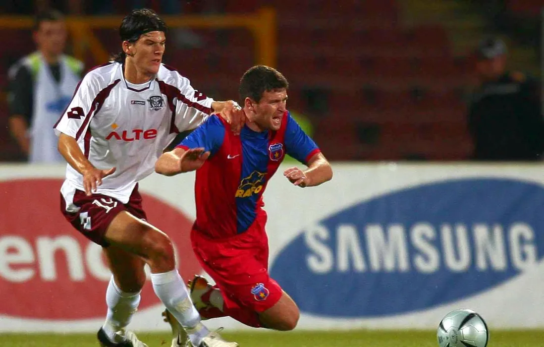 Rapidistul Cristian Sapunaru (stanga) lupta pentru minge cu stelistul Daniel Oprita (dreapta), in meciul din Supercupa Romaniei, disputat pe stadionul "Lia Manoliu", in Bucuresti, sambata, 22 iulie 2006. ANDREI PUNGOVSCHI / MEDIAFAX FOTO