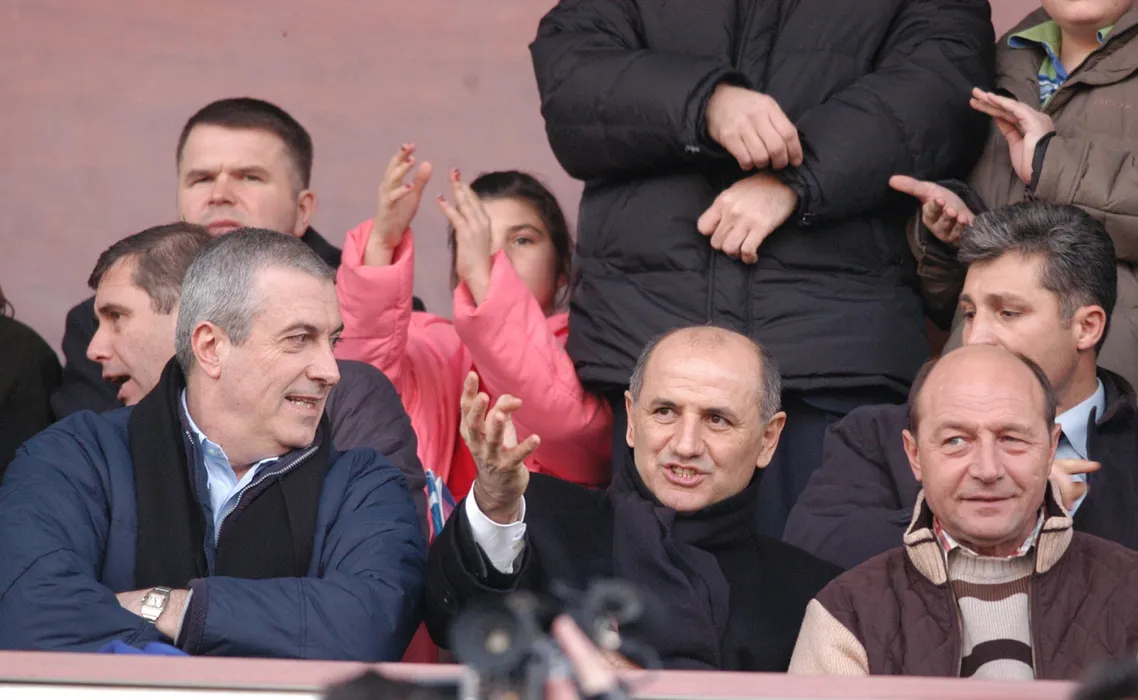 Calin Popescu Tariceanu, George Copos si Traian Basescu in tribuna la meciul de fotbal dintre Rapid Bucuresti si Hamburg SV, contand pentru Cupa UEFA, desfasurat pe Stadionul Giulesti-Valentin Stanescu din Bucuresti, joi 9 martie 2006. © FOTO:Razvan Pasarica/SPORT PICTURES