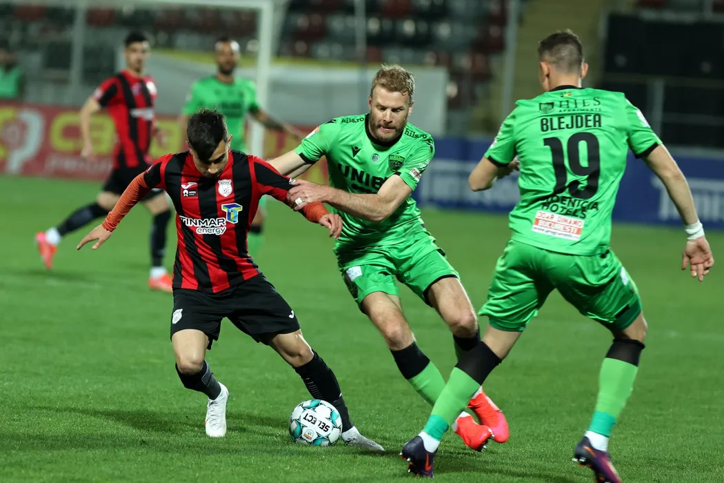 George Merloi (S), de la AFC Astra Giurgiu, lupta pentru balon cu Adam Nemec (D), de la Dinamo, in meciul de fotbal din semifinalele Cupei Romaniei, disputat pe stadionul Marin Anastasovici din Giurgiu, marti, 13 aprilie 2021. GEORGE FILIP / MEDIAFAX FOTO